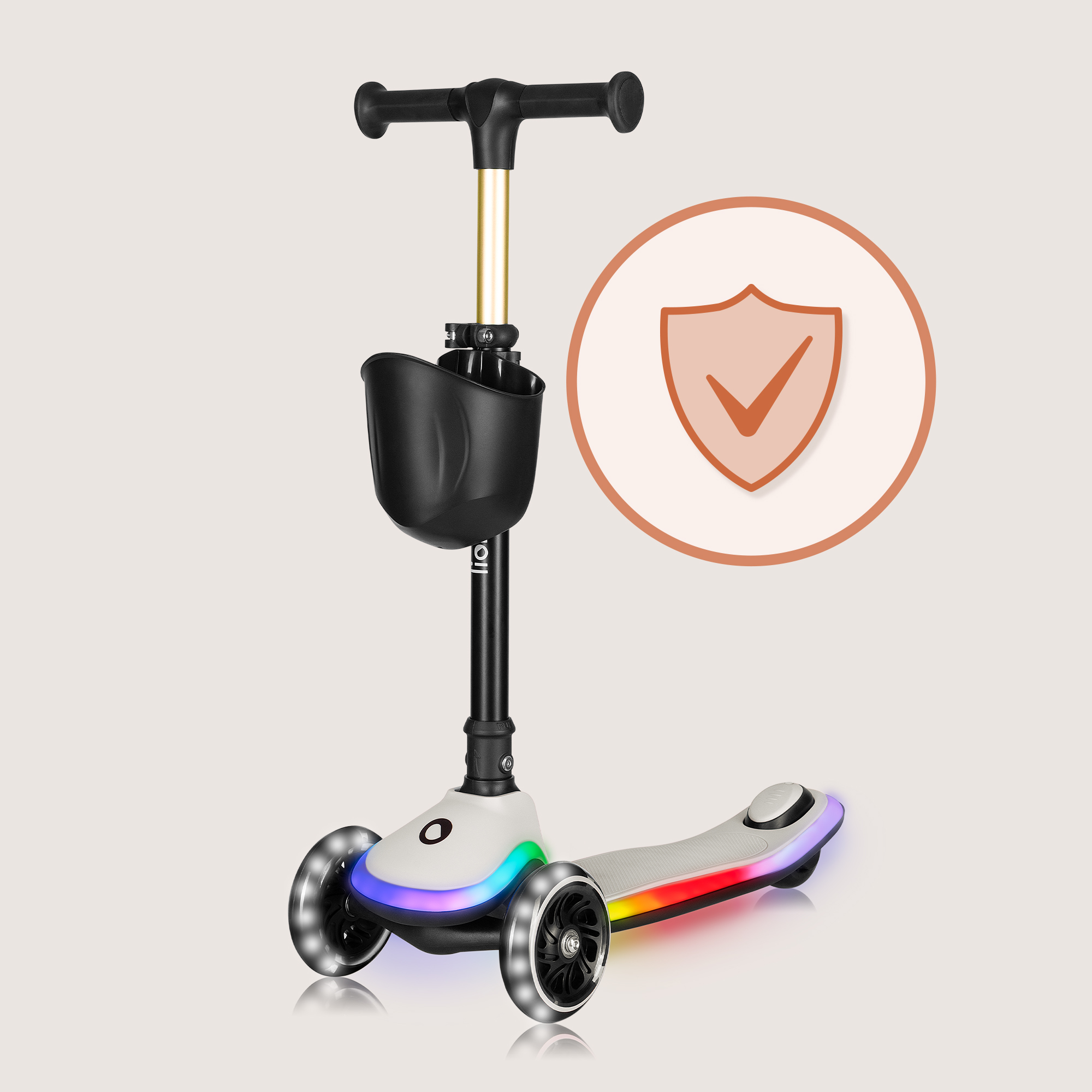 Even safer – LED lighting in the wheels The front wheels light up white, which not only looks great, but also makes your child always visible – always, because the lights are powered and activated by motion and require no batteries to work!