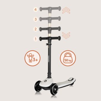 It is suitable already for 3-year-olds, but older and much bigger kids can enjoy it too! Thanks to its high weight capacity of up to 50 kg and a 4-level adjustable handlebar, this scooter can be easily adapted to your child’s current height.