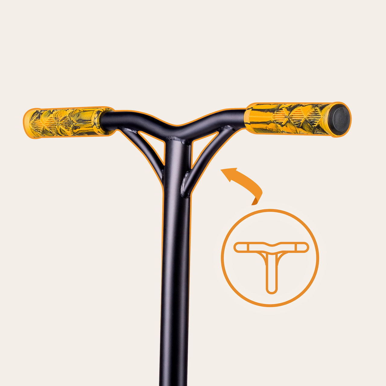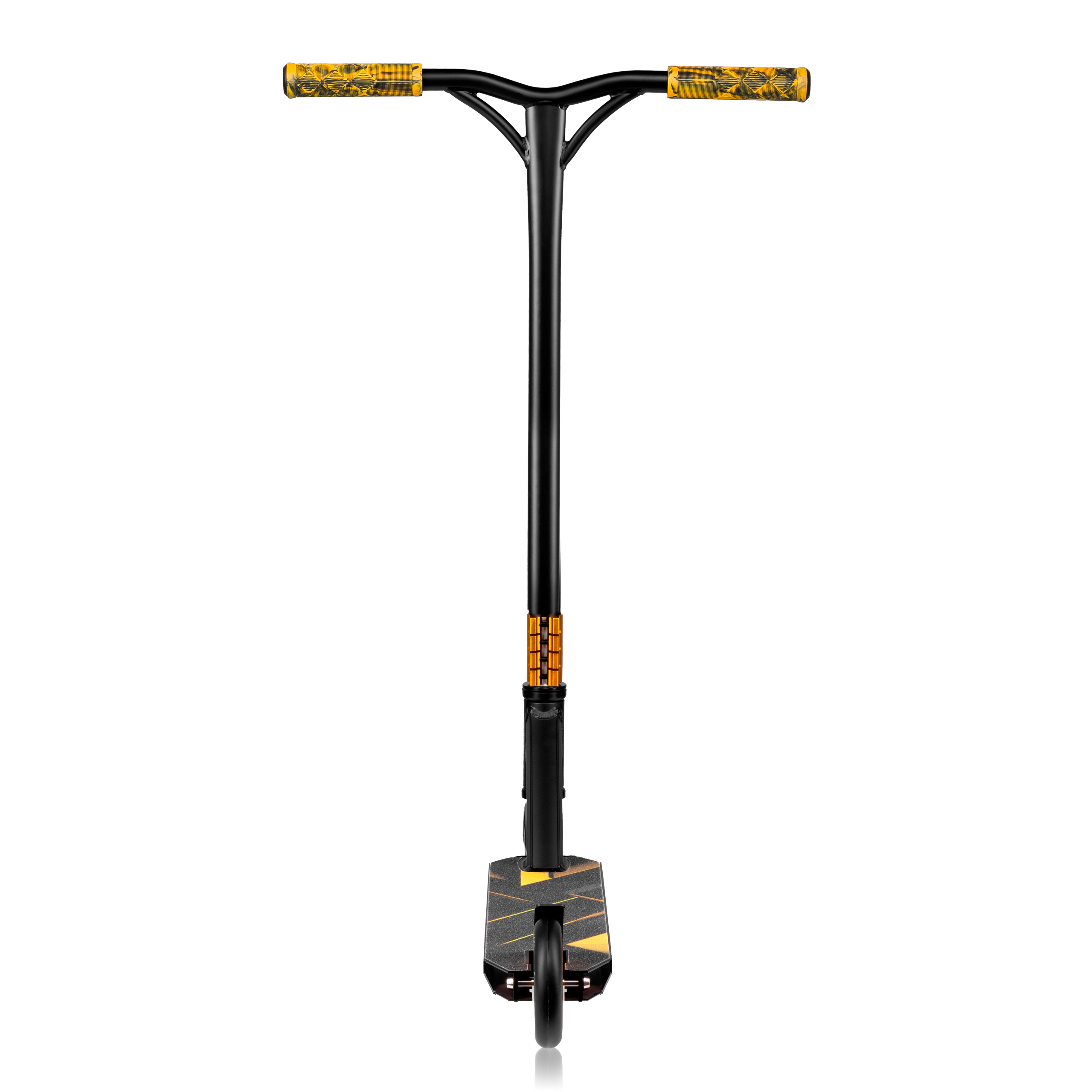 The ergonomic one-piece Y-bar handlebar with a 4-hole clamp ensures proper riding posture and provides superior ergonomics for performing tricks and effortless riding. Special rubber grips prevent hands from slipping. The contoured and spacious deck enables comfortable foot positioning.