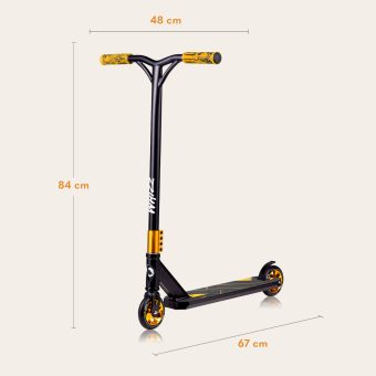 lionelo Whizz Carbon Yellow is a cutting-edge freestyle scooter designed to accommodate children weighing between 20 and 100 kg, which makes it perfect for both beginners and more advanced riders. ABEC-9 bearings are characterized by high-precision manufacturing, ensuring both durability and high-speed performance. The HIC compression system enhances the stability of the structure while keeping it lightweight, which improves everyday riding experience and facilitates tricks. The wide Y-bar handlebar and anti-slip deck improve the scooter’s riding ergonomics. Whizz Carbon Yellow is a model made of high-grade aluminium ensuring durability.